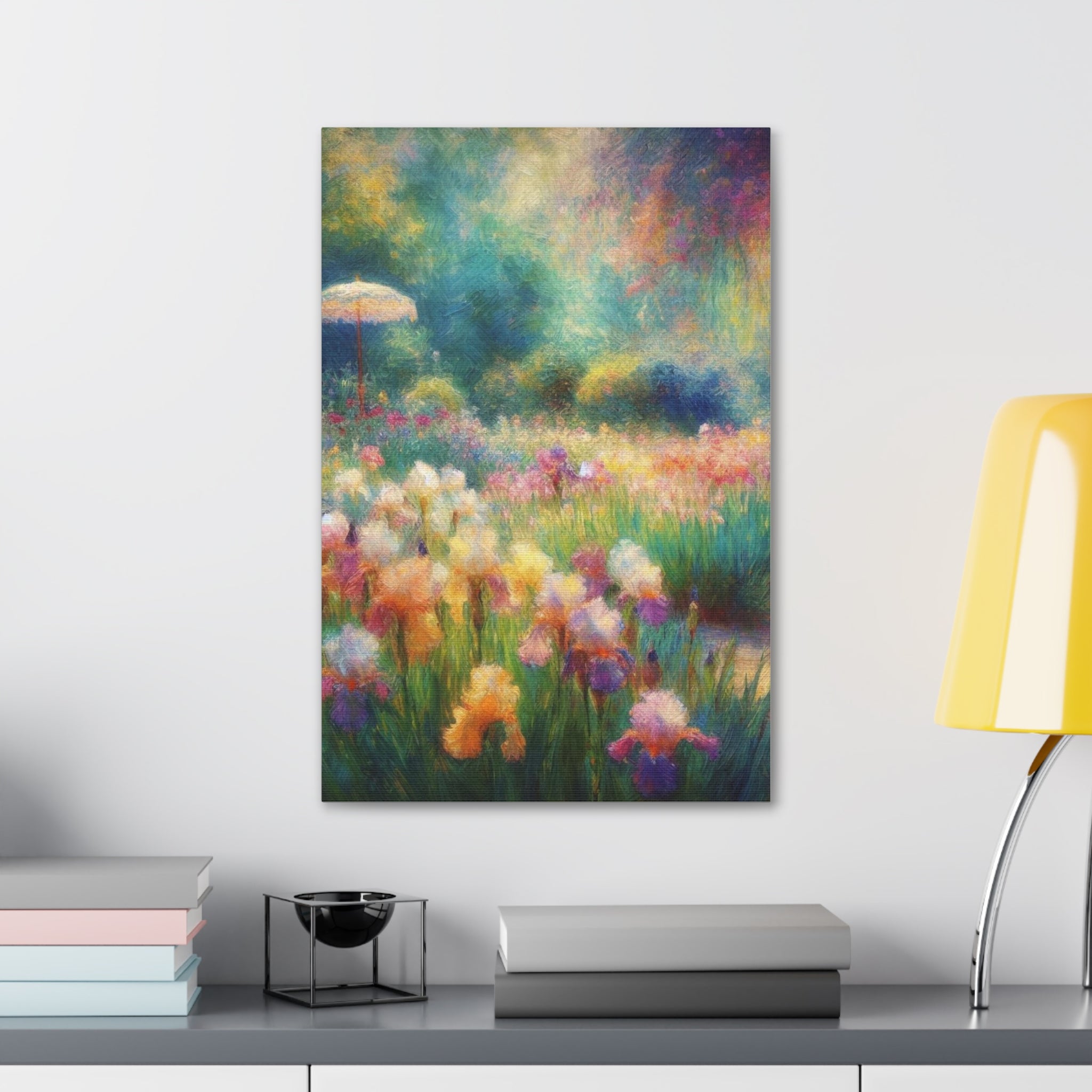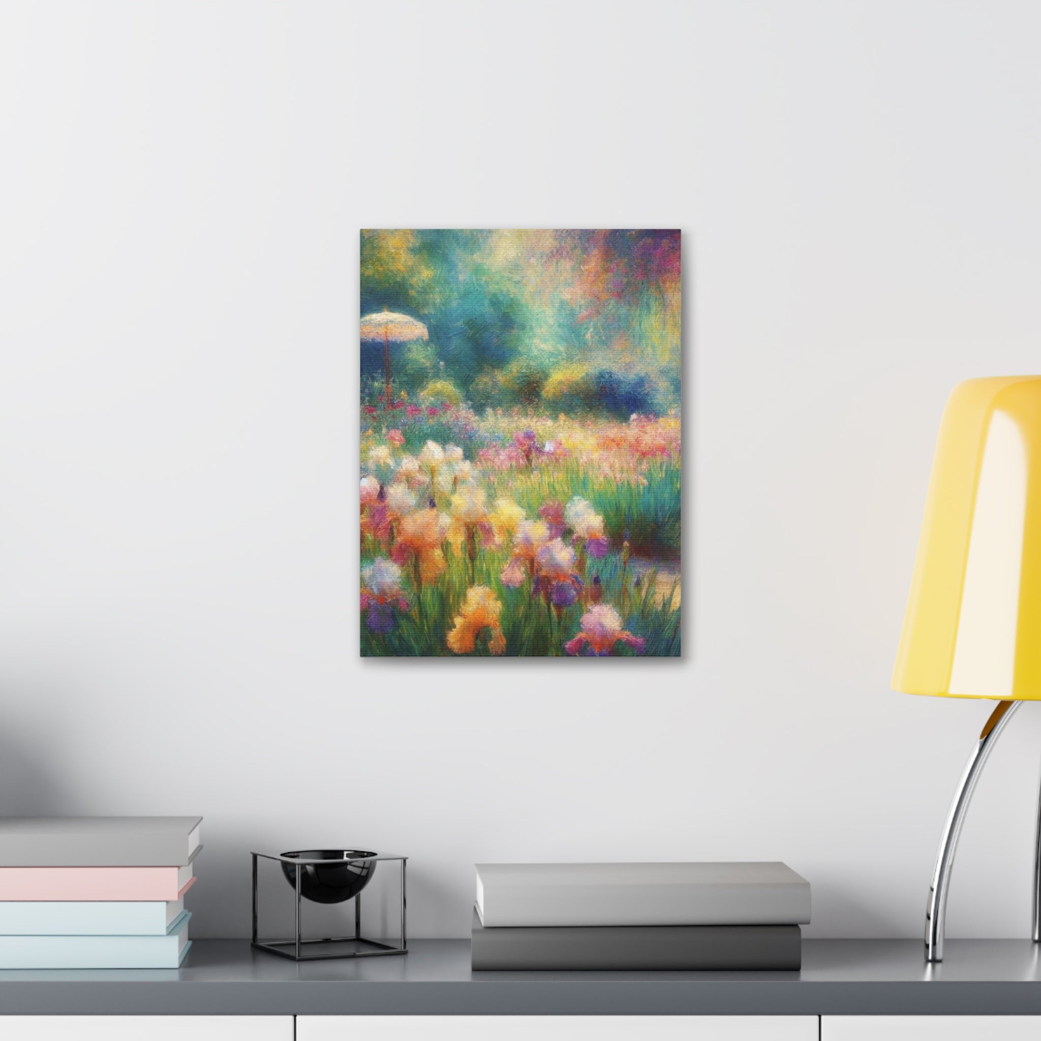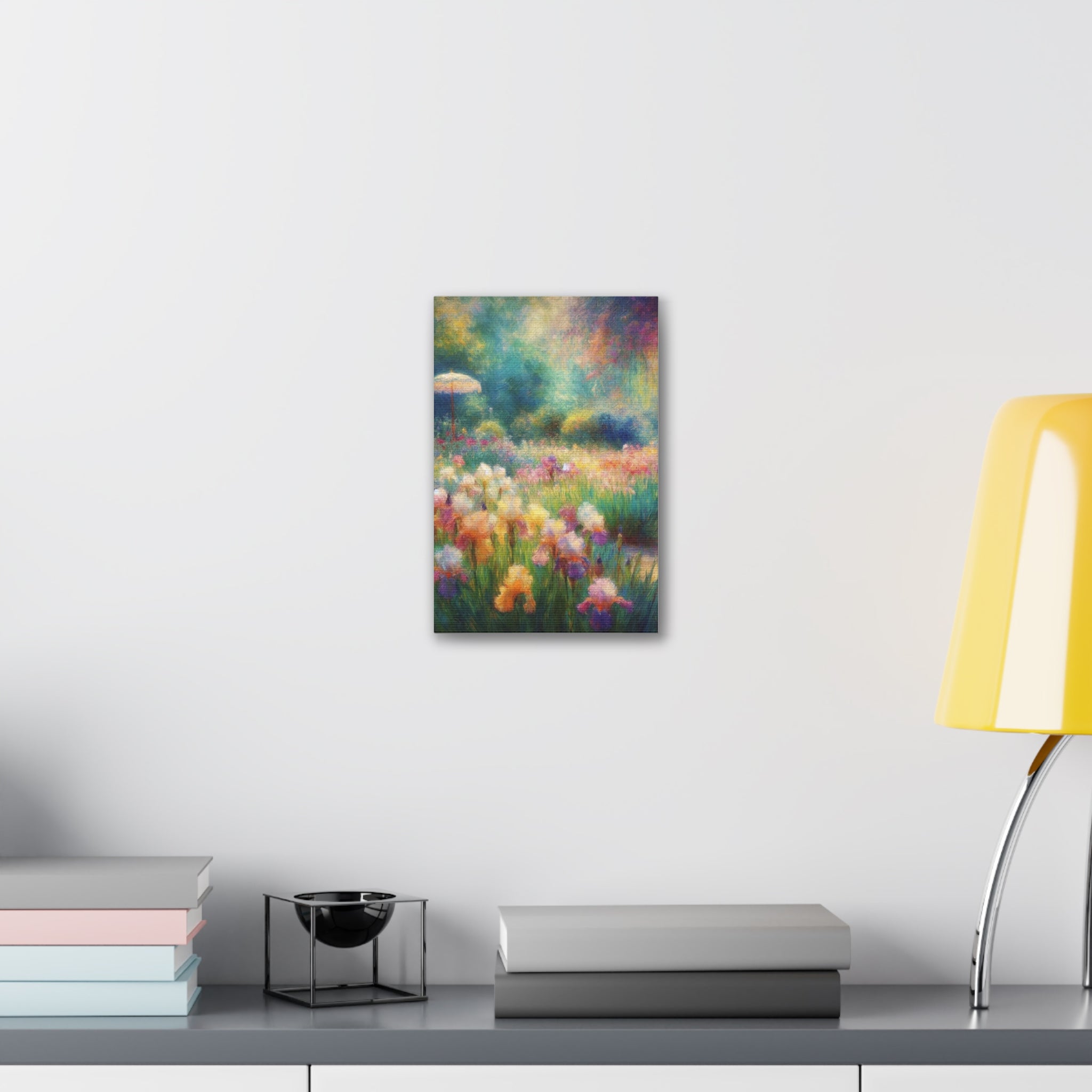 A luminous stretched canvas that brings a painterly meadow into your room. Soft washes of color—pastel lilies, sunlit greens, and hazy blues—feel like a memory of a summer morning. The semi-gloss polyester surface keeps colors vivid and slightly luminous, while the hand-stretched fabric over a sturdy pine frame gives the piece depth and presence on the wall. Comes ready to hang with mounting hardware; a small QR code on the back links to details about the artwork. It’s a quiet, uplifting focal point that warms living rooms, bedrooms, or home offices without overpowering the space.