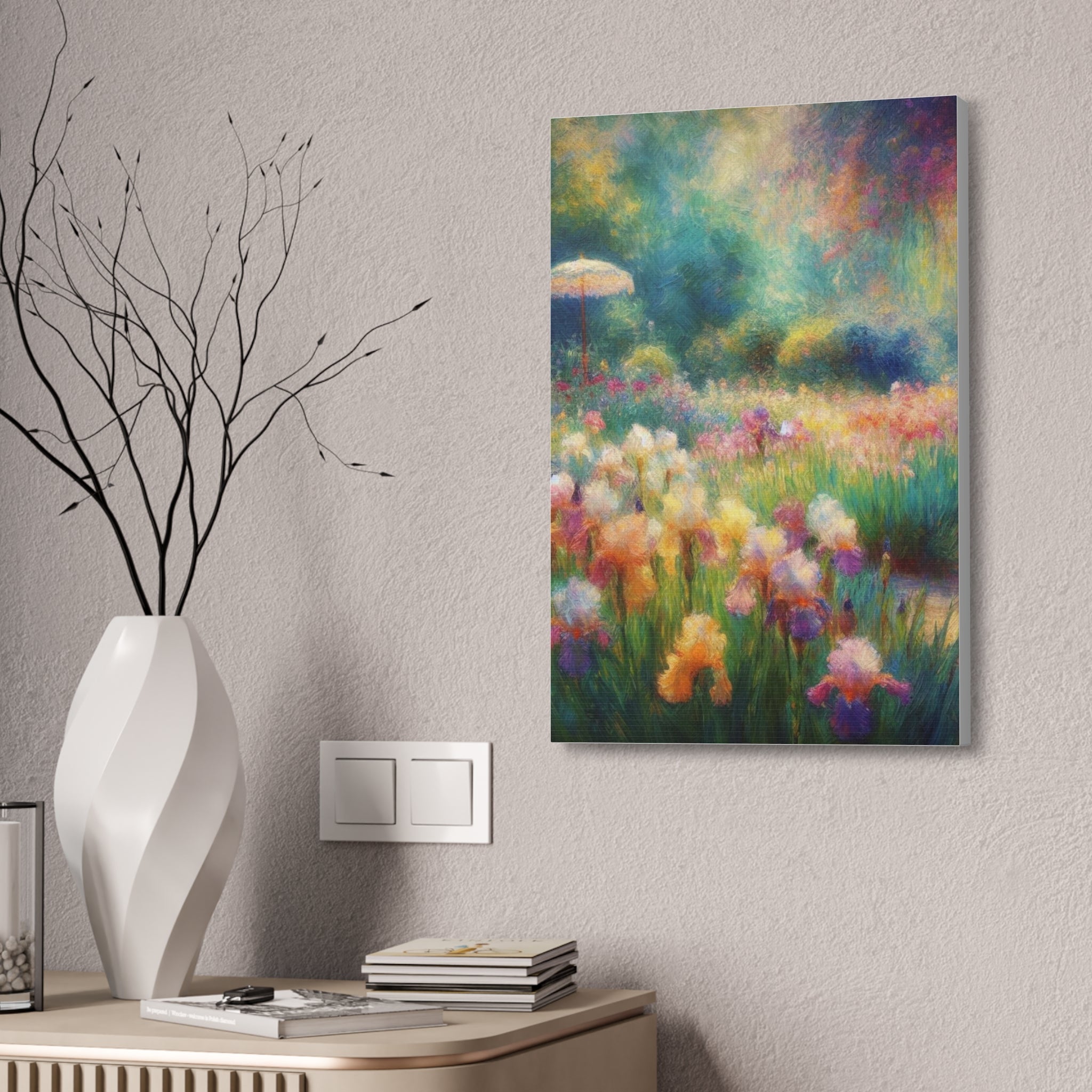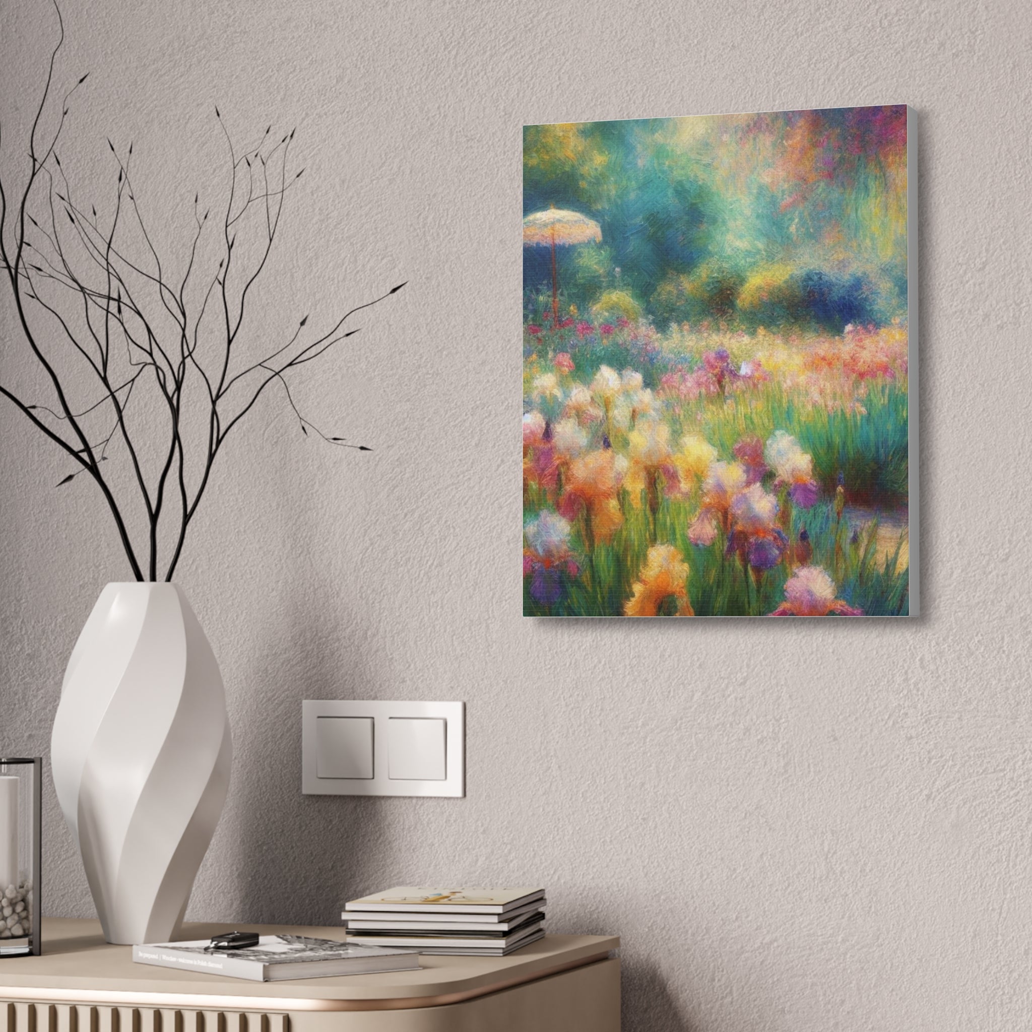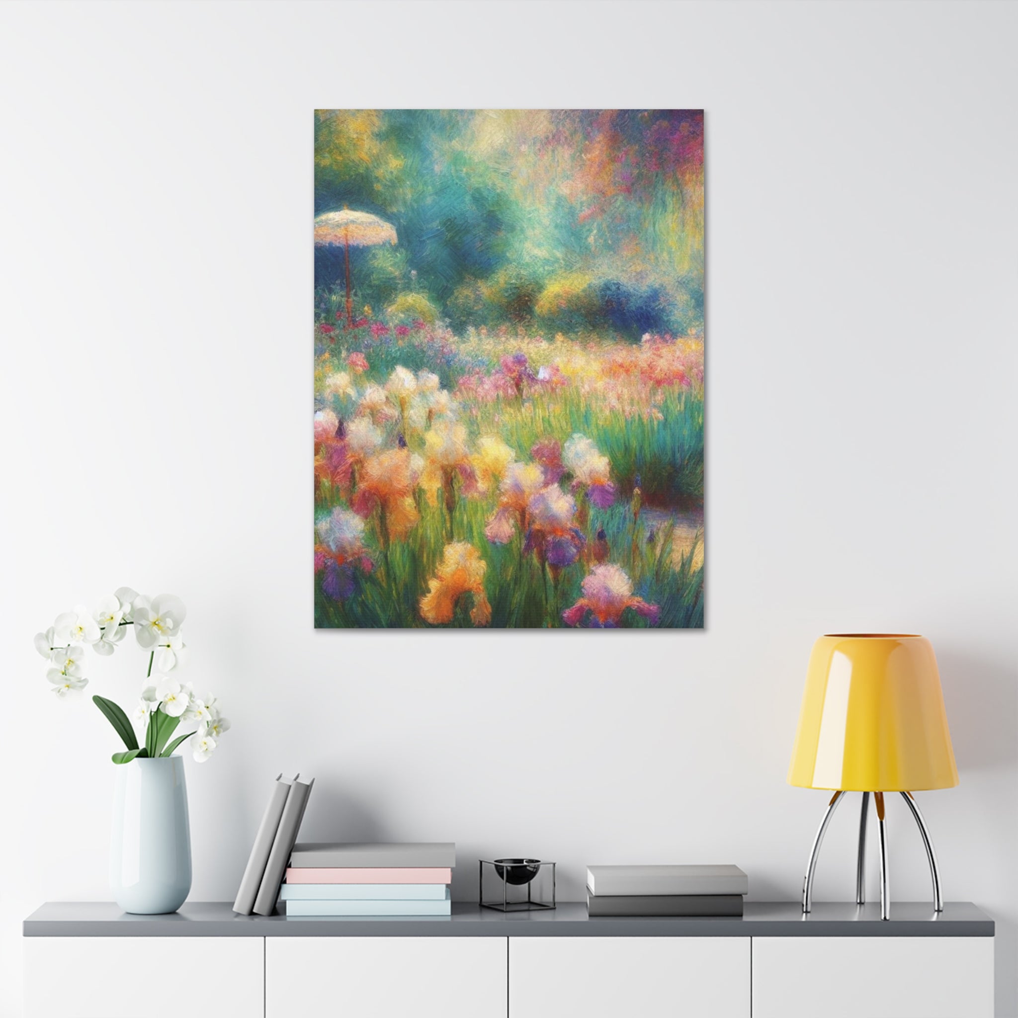 A luminous stretched canvas that brings a painterly meadow into your room. Soft washes of color—pastel lilies, sunlit greens, and hazy blues—feel like a memory of a summer morning. The semi-gloss polyester surface keeps colors vivid and slightly luminous, while the hand-stretched fabric over a sturdy pine frame gives the piece depth and presence on the wall. Comes ready to hang with mounting hardware; a small QR code on the back links to details about the artwork. It’s a quiet, uplifting focal point that warms living rooms, bedrooms, or home offices without overpowering the space.