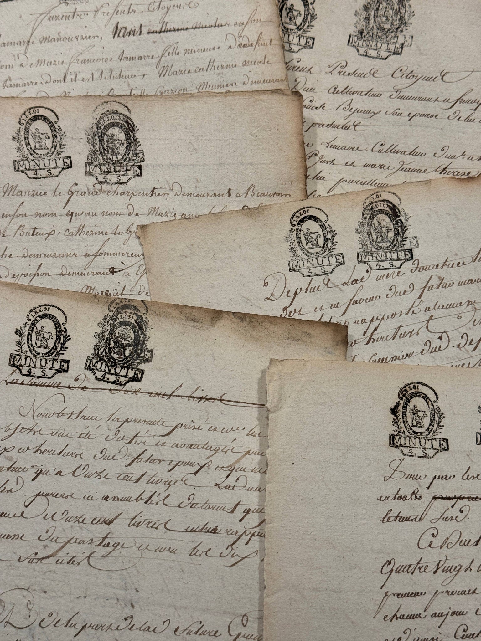 Stunning ORIGINAL antique double-stamped French script documents. All old and in GREAT condition. You are purchasing ONE stamped document page. These are all one-of-a-kind originals from France. Each one is unique. They are perfect for decoupage, altered art, mixed media, and so much more. Framing these as is is PERFECT. The hand-lettered calligraphy is amazing. Each one has its original stamp either on the front or the back. They measure approximately 7" x 10". Sold individually. Please note: Due to the nature of the product, this item can not be restocked.